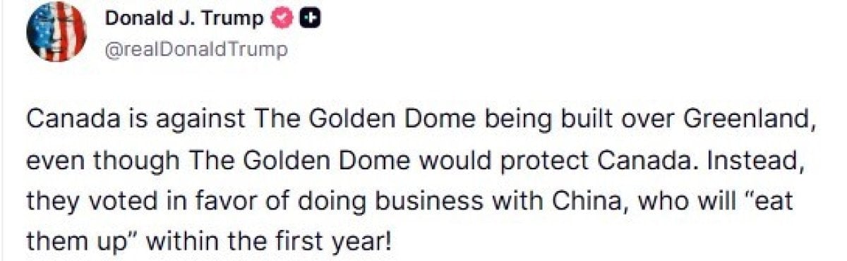 Sahibi olduğu truth sosyal medya platformundan bir mesaj yayınlayan Trump, Kanada’nın Grönland’a Altın Kubbe (Golden Dome) savunma kalkanının inşa edilmesine karşı çıktığını belirterek, “Oysa Altın Kubbe Kanada’yı da koruyacak. Bunun yerine Kanada, ilk yıl içinde kendilerini ‘yutacak’ olan Çin ile iş yapmayı tercih etti” eleştirisinde bulundu.