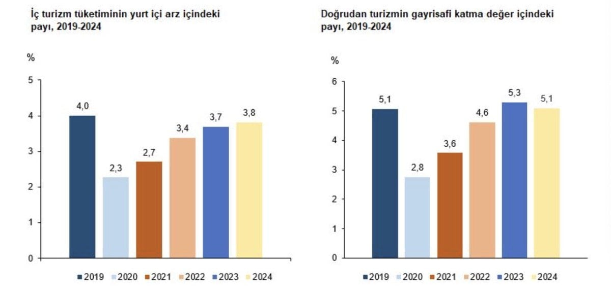Ülkemizde doğrudan turizm amaçlı gayrisafi katma değer 2024 yılında 2 trilyon 21 milyar 129 milyon 805 bin TL olarak gerçekleşti. Doğrudan turizm amaçlı gayrisafi katma değerin toplam gayrisafi katma değer içerisindeki payı yüzde 5,1 oldu.