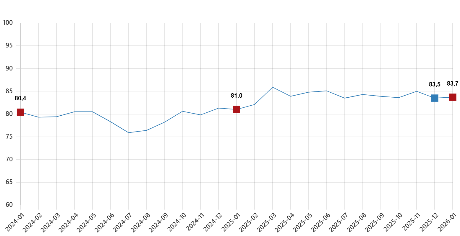 Türkiye İstatistik Kurumu ve Türkiye Cumhuriyet Merkez Bankası işbirliği ile yürütülen tüketici eğilim anketi sonuçlarından hesaplanan tüketici güven endeksi, Aralık ayında 83,5 iken Ocak ayında %0,3 oranında artarak 83,7 oldu.