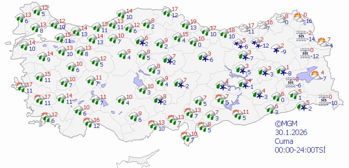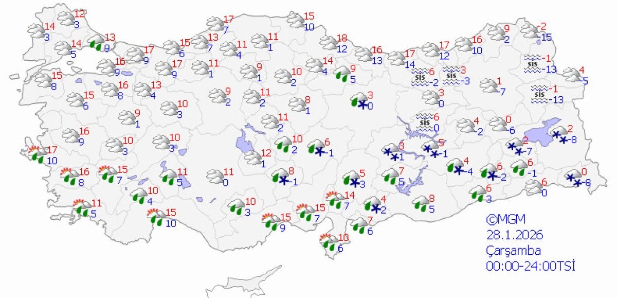 Batı ve güneyde 8-17 derece aralığında yağmurlu havanın hakim olacağı; genel olarak doğu bölgelerde kar, batıda yağmur şeklinde yağış öngörülüyor.