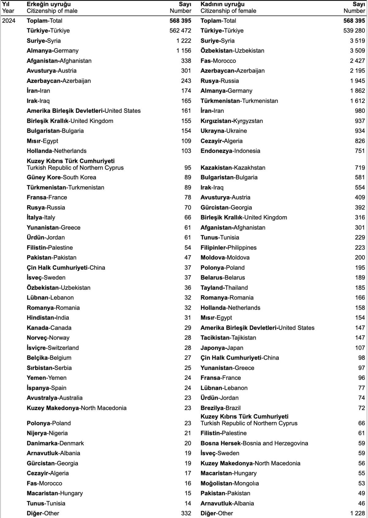 Toplam evlenmeler içinde yabancı kişiler ile evlenmeler incelendiğinde, yabancı damatların sayısı 2024 yılında 5 bin 923 olup, toplam damatların yüzde 1,0’ını oluştururken yabancı gelinlerin sayısı 29 bin 115 olup toplam gelinlerin yüzde 5,1’ini oluşturdu.