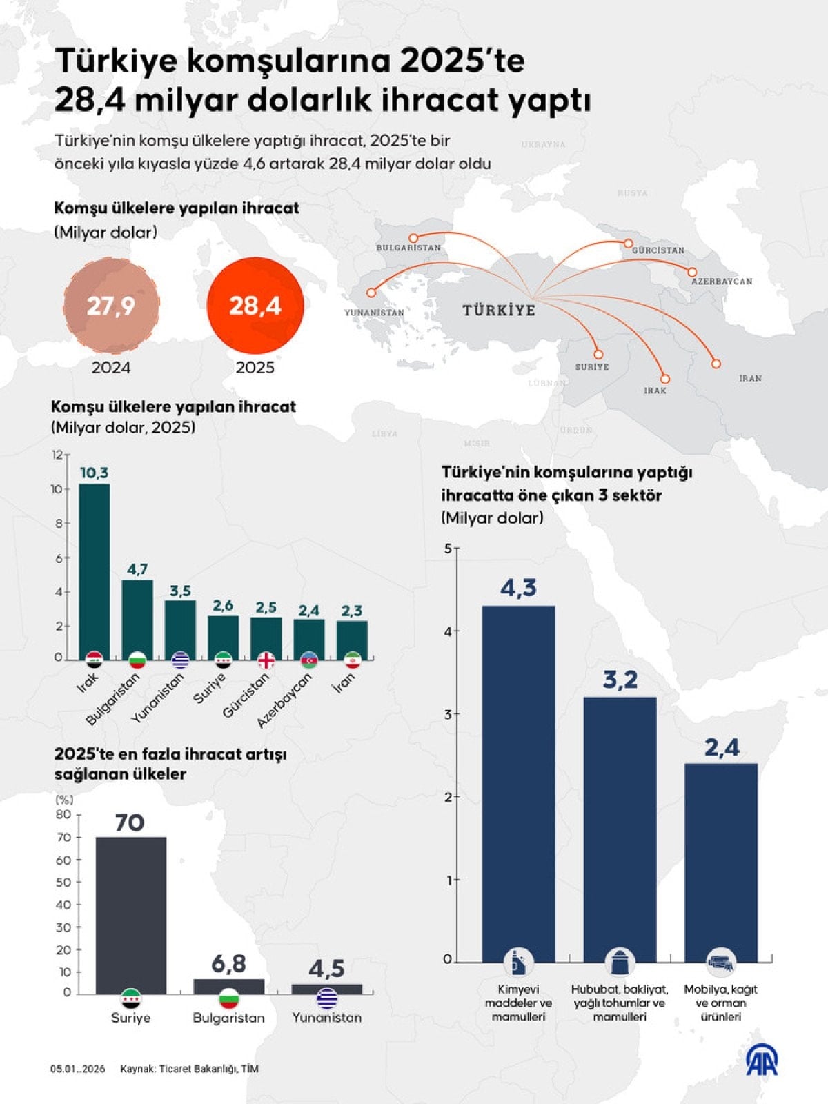 Türkiye, 2025’te komşuları Azerbaycan, Bulgaristan, Gürcistan, Irak, İran, Suriye ve Yunanistan’a 28 milyar 352 milyon 370 bin dolarlık ihracat yaptı.