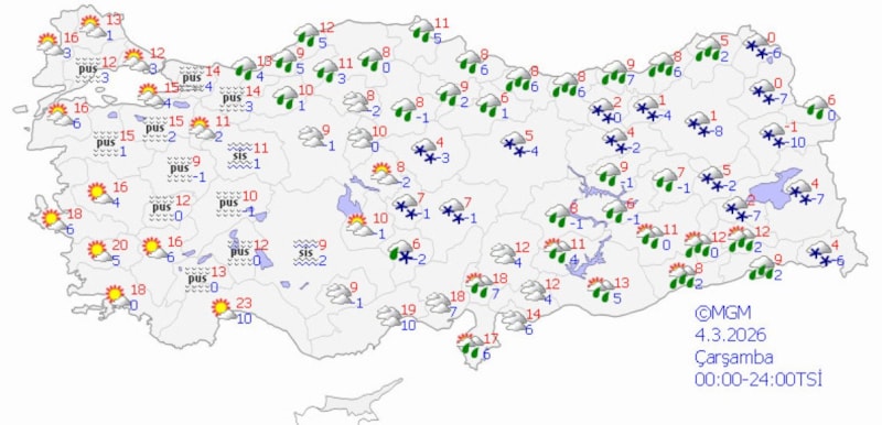 Bugün, yurdun batı ve iç kesimlerinde pus, sis ve düşük bulutluluk hakim.