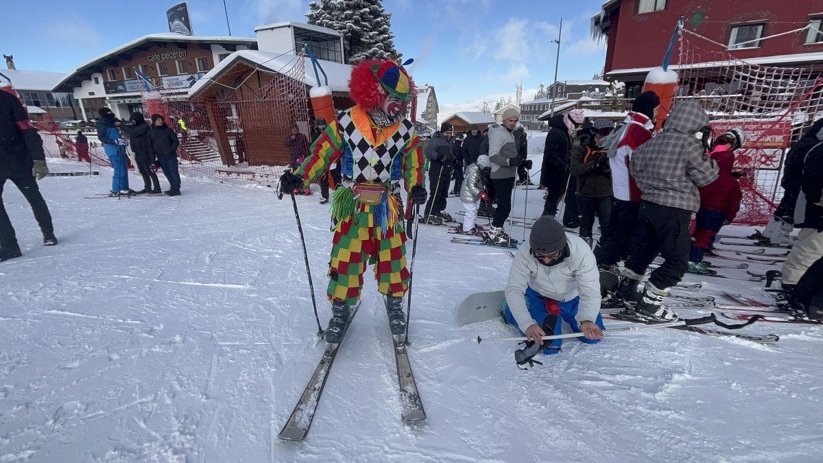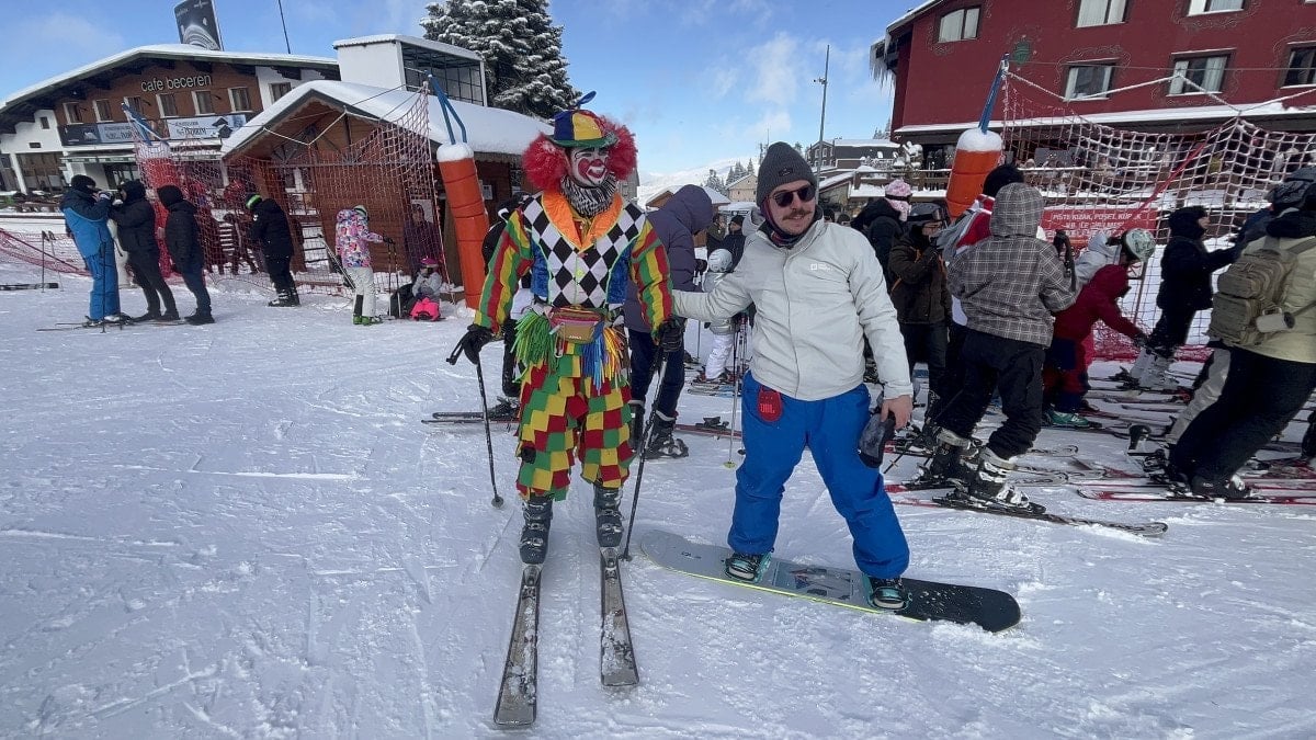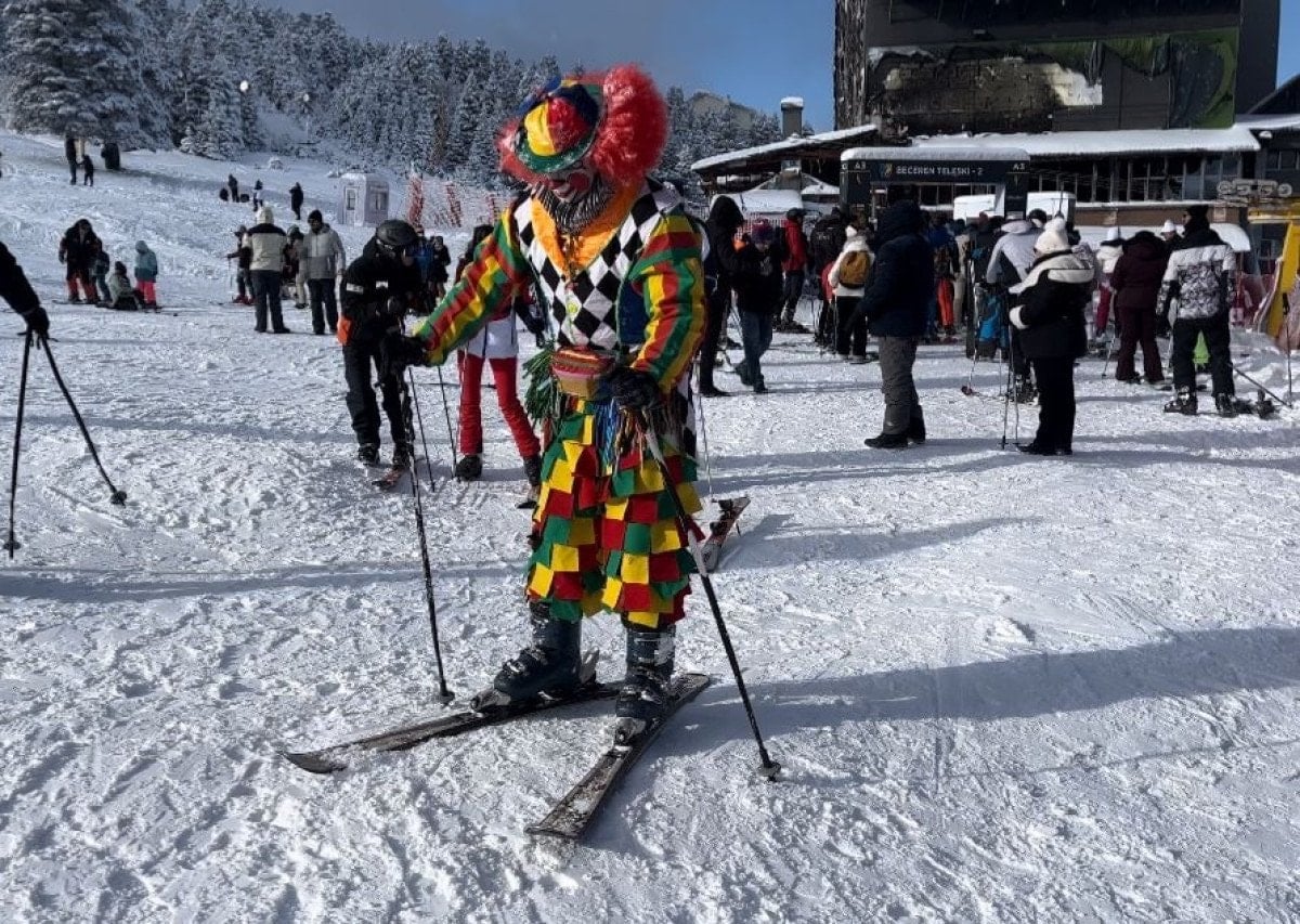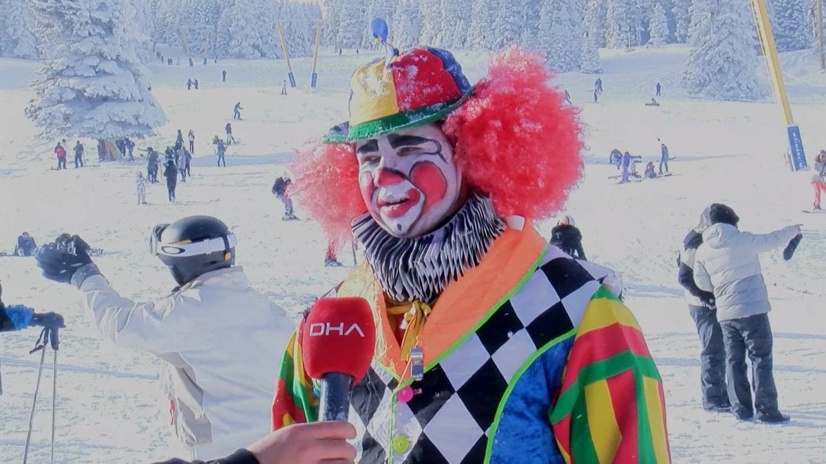 Bursa’da profesyonel animatörlük yapan Mücahit Değirmenci, farkındalık yaratmak ve tatilcilere moral vermek amacıyla palyaço kostümünü giyip, kayak takımlarını kuşandı.