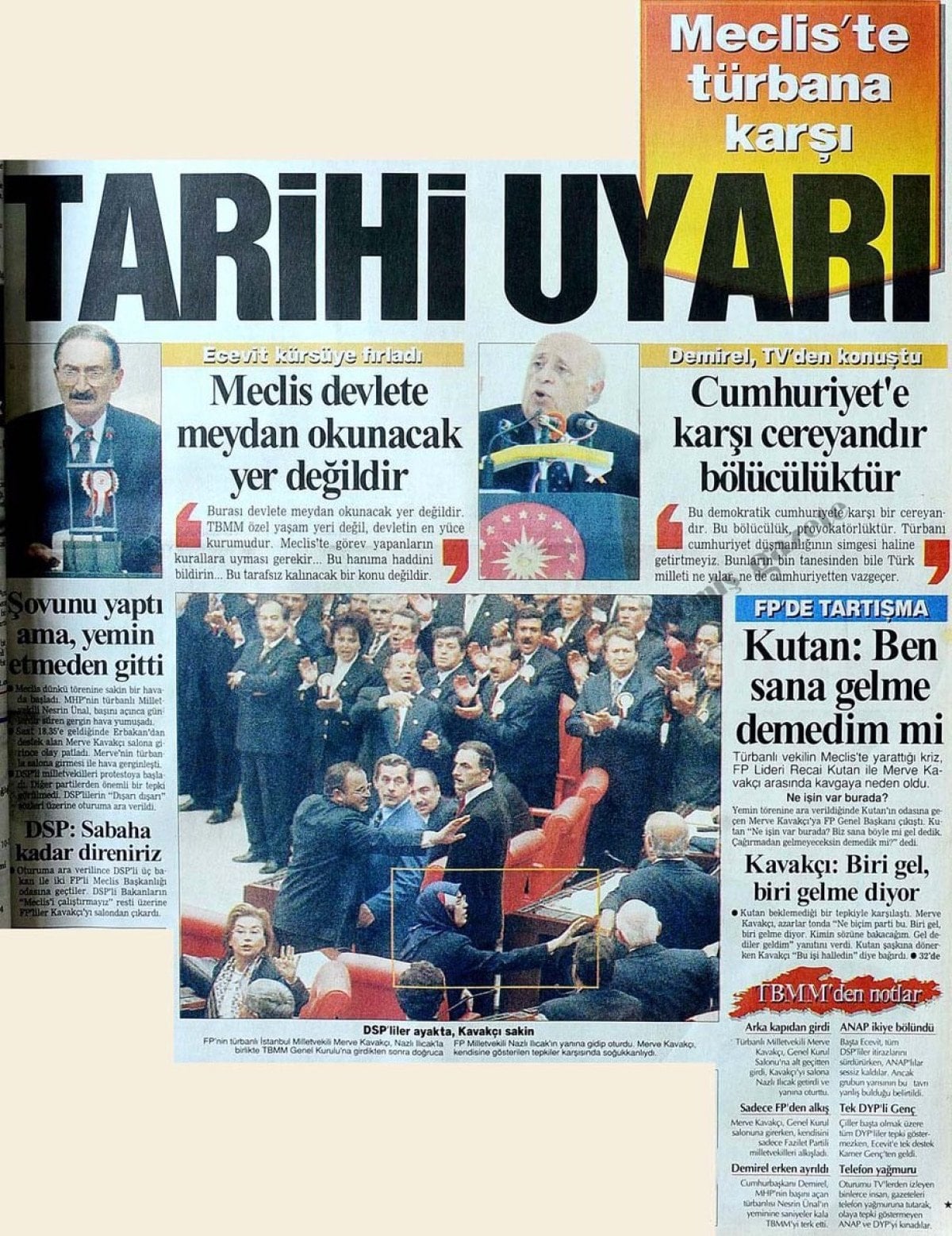 Böylece, Fazilet Partisi İstanbul Milletvekili Merve Kavakçı’nın milletvekili yemini etmesi fiilen engellenmişti. DSP’lilerin teamül ve İç Tüzük tanımaz tutumları gerginliği iyice arttırınca oturumu yöneten Geçici Başkan Ali Rıza Septioğlu birleşime ara vermiş, ardından da Merve Kavakçı, yemin edemeden Genel Kurul salonundan ayrılmak zorunda kalmıştı.