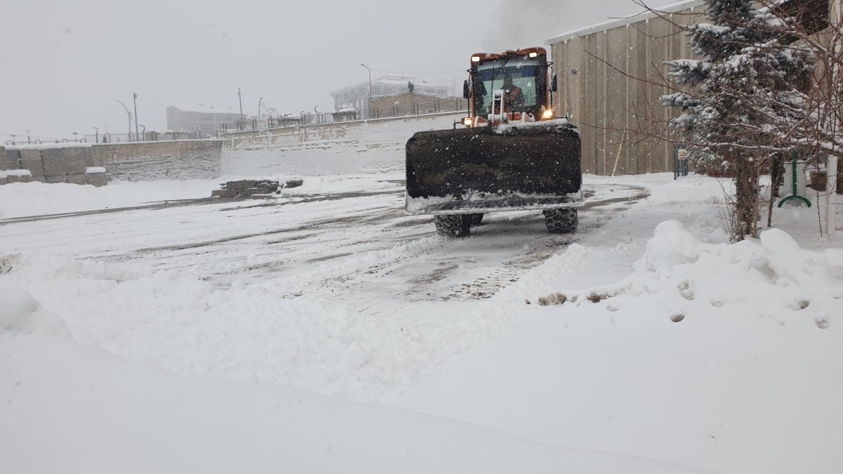 İlçede park halindeki araçlar kara gömülürken, belediye ekipleri trafikte aksama yaşanmaması için kar temizliği yaptı.
