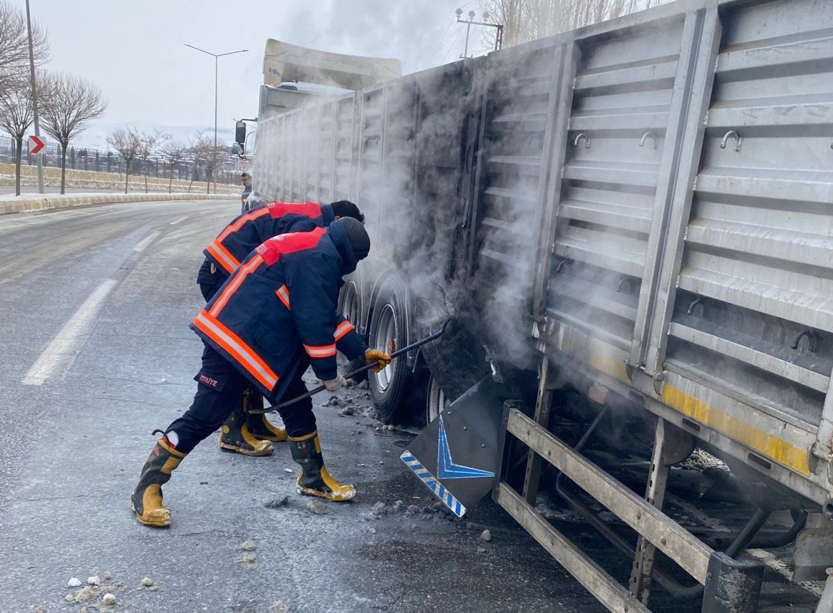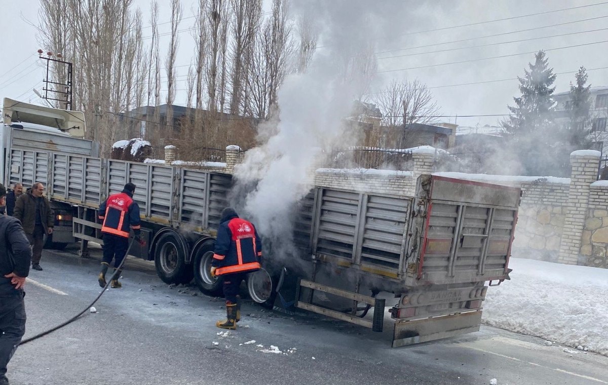 Van’ın Edremit ilçesinde Su Sporları binası yakınlarında, seyir halinde ilerleyen tırın balatalarının aşırı ısınması nedeniyle lastikler alev aldı.