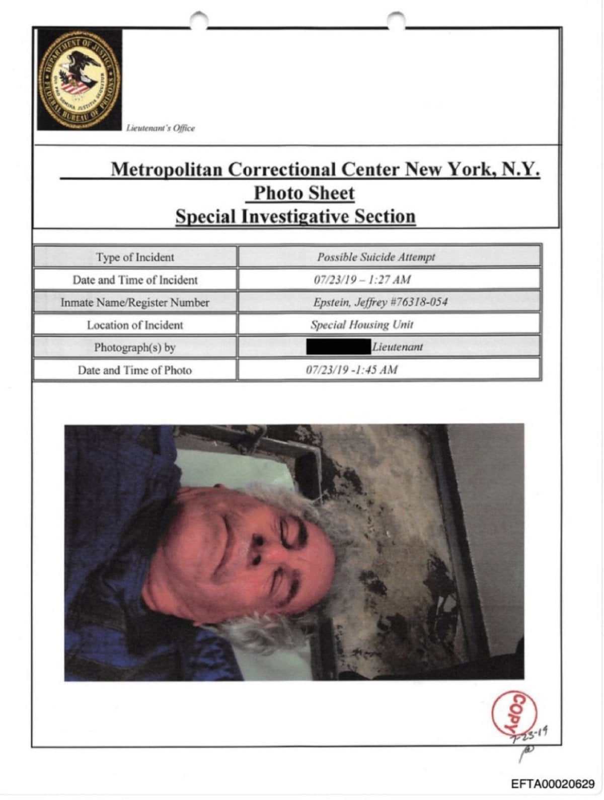 Yeni erişilen kayıtlar Epstein’in 23 Temmuz 2019’da Metropolitan Correctional Center’daki (MCC) hücresinde baygın bulunduğunu yazıyor.