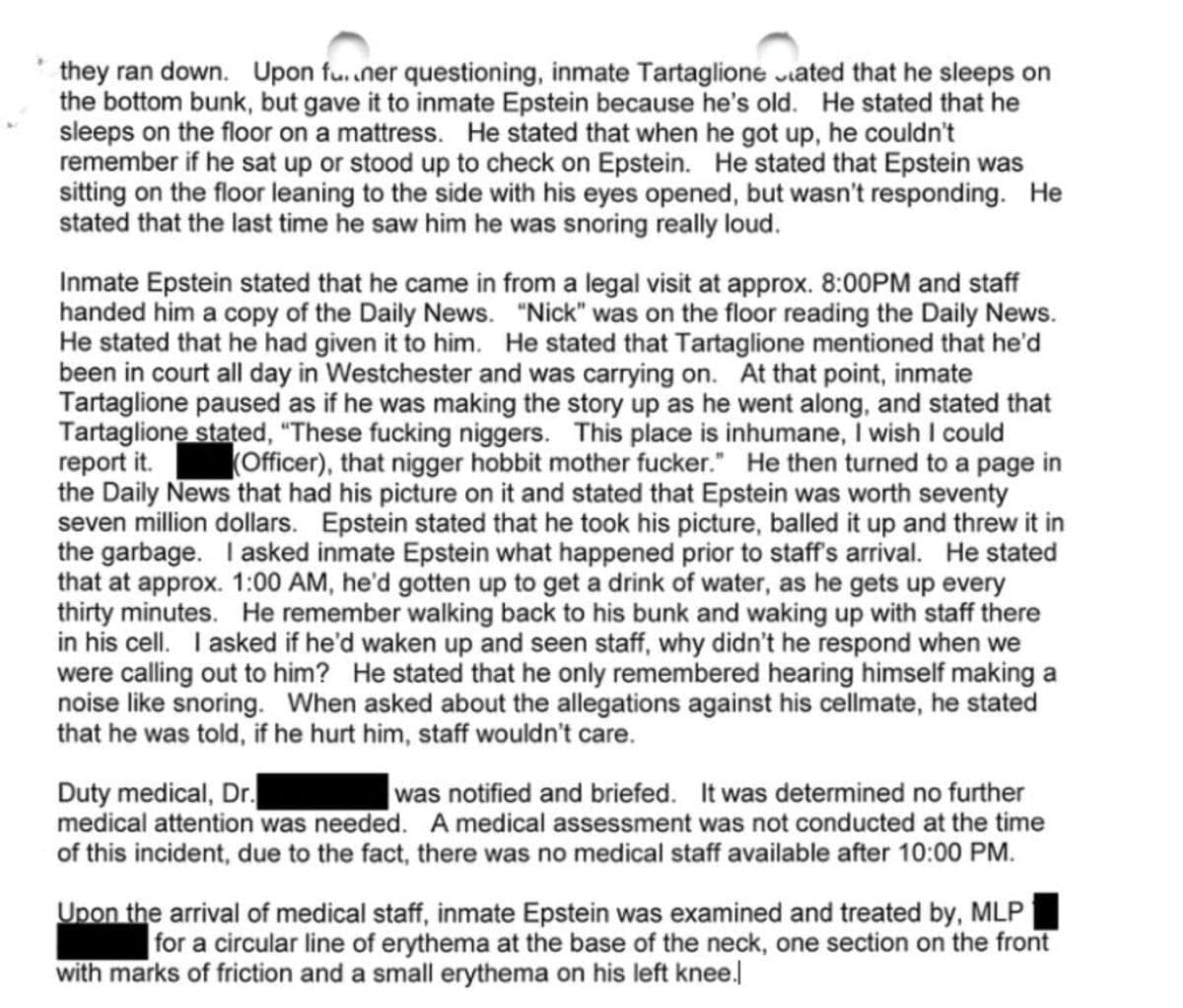 Olayın ardından hücre arkadaşı eski polis Nicholas Tartaglione’nin agresif davranışlar sergilediği, boynunda bir iple milyarder ile alay ettiği raporlandı.