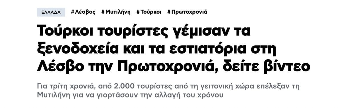 Protothema, “Türk turistler yılbaşı gecesi Midilli’deki otelleri ve restoranları doldurdu. Komşu ülkeden 2 binden fazla turist, bir kez daha yılbaşı kutlamaları için Yunan adasını tercih etti. Türklerin varlığı nedeniyle Midilli’deki otellerin neredeyse tamamı doldu.