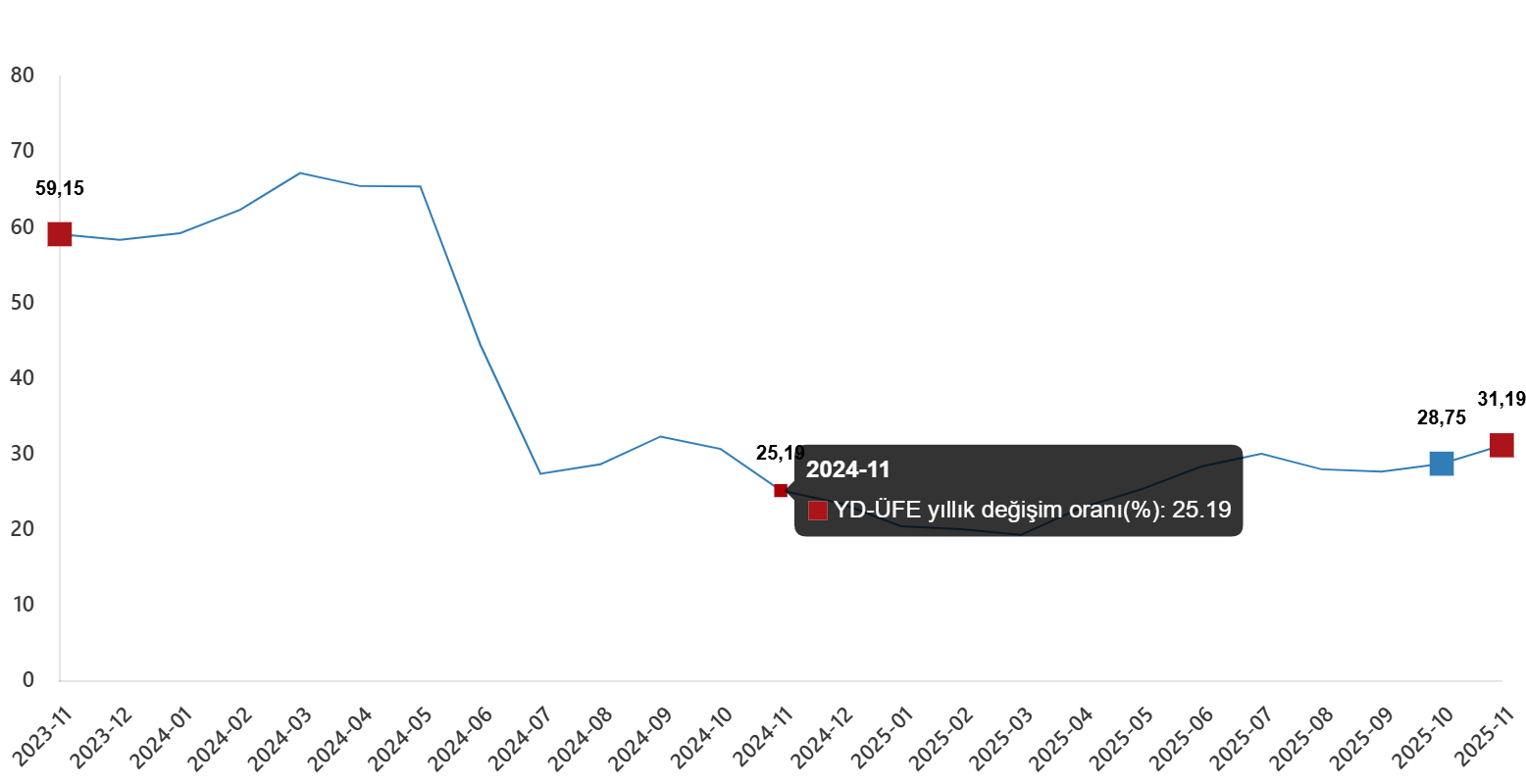 YD-ÜFE 2025 yılı Kasım ayında bir önceki aya göre %1,02 artış, bir önceki yılın Aralık ayına göre %30,01 artış, bir önceki yılın aynı ayına göre %31,19 artış ve on iki aylık ortalamalara göre %25,67 artış gösterdi.