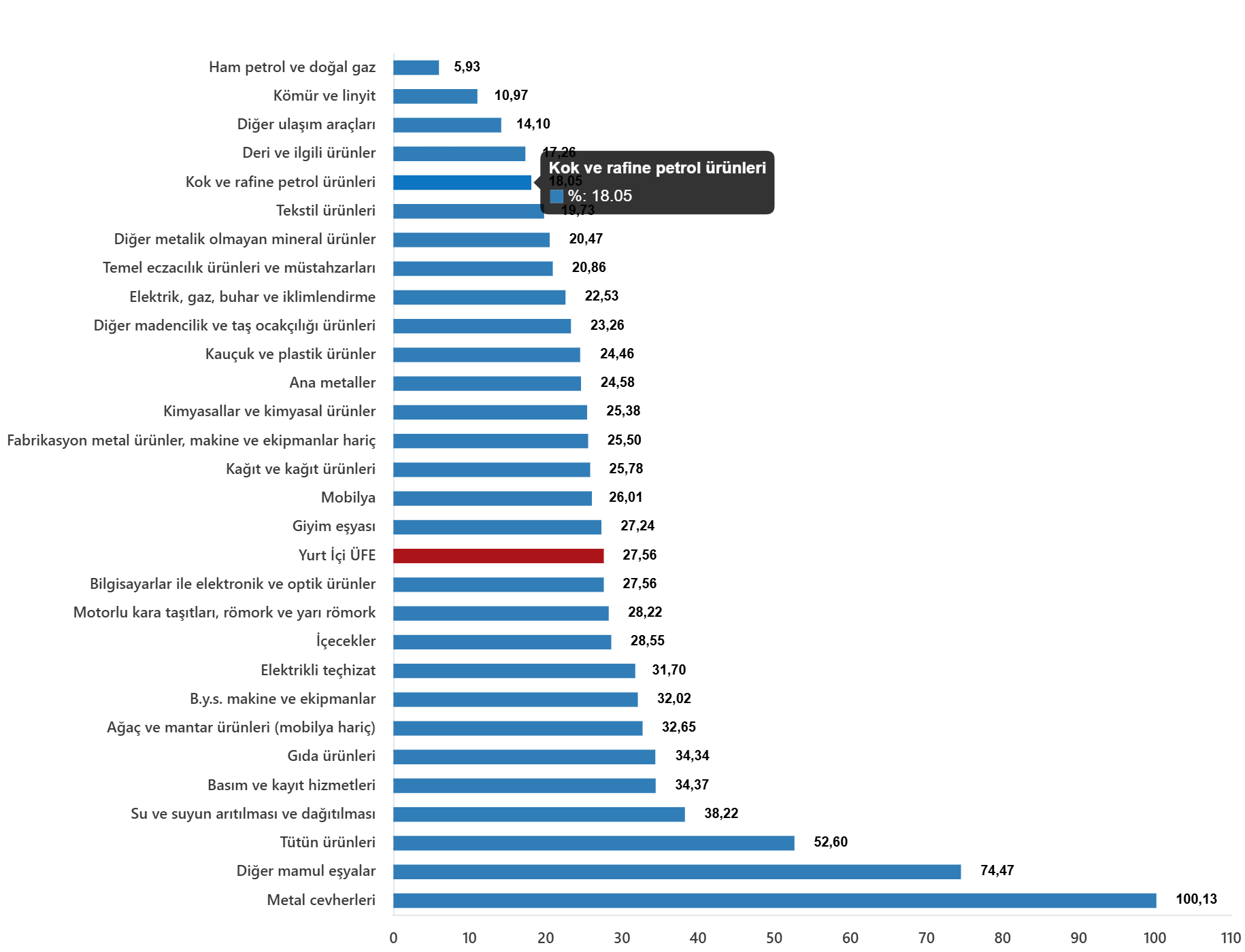 Ana sanayi gruplarının yıllık değişimleri; ara mallarında %26,09 artış, dayanıklı tüketim mallarında %32,14 artış, dayanıksız tüketim mallarında %31,57 artış, enerjide %20,68 artış ve sermaye mallarında %29,51 artış olarak gerçekleşti.