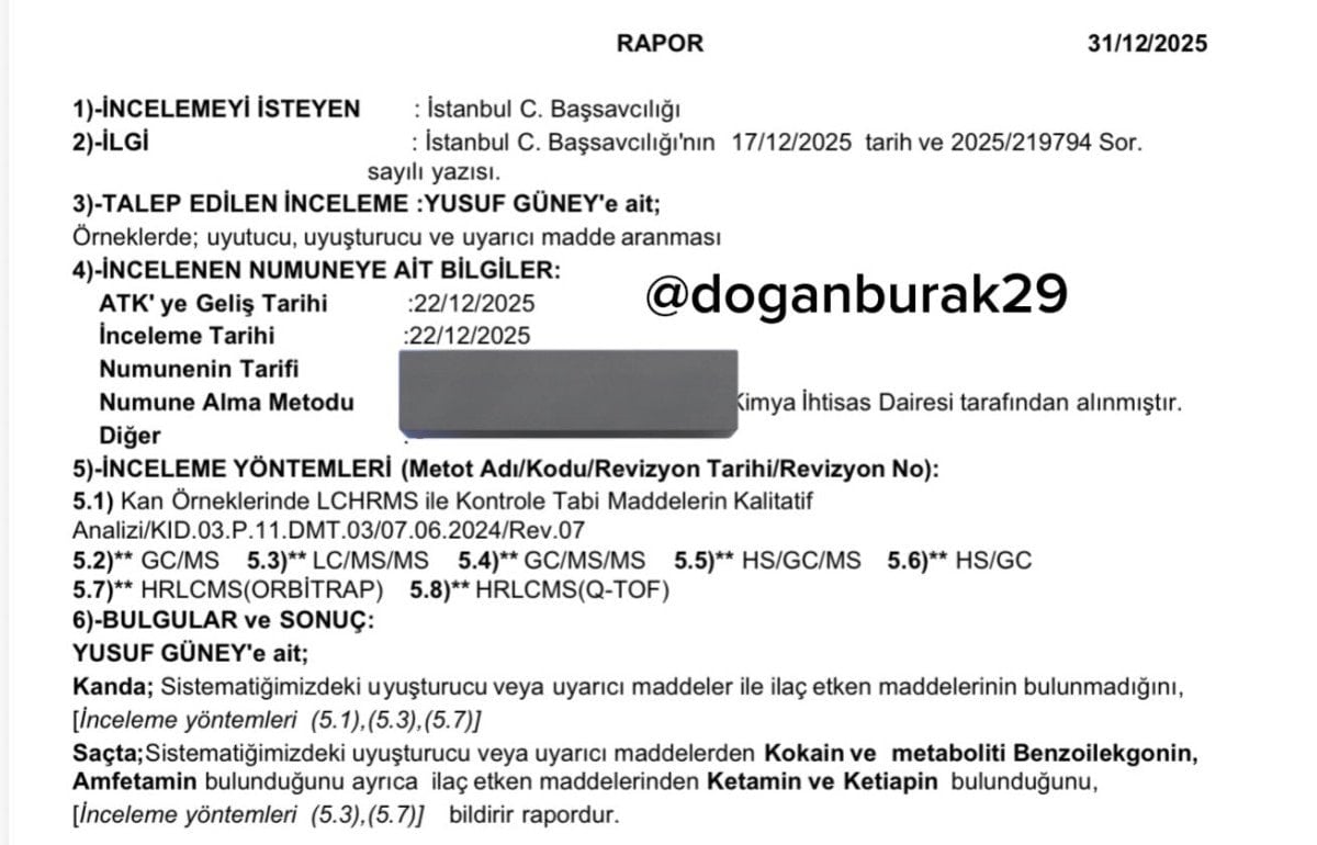 Magazin dünyasında geniş yankı uyandıran uyuşturucu soruşturmasında adı geçen Yusuf Güney hakkında yapılan adli tıp incelemesinin sonuçları ortaya çıktı. İstanbul Cumhuriyet Başsavcılığı tarafından yürütülen soruşturma kapsamında Güney’den alınan saç, kan ve kıl örnekleri incelendi.